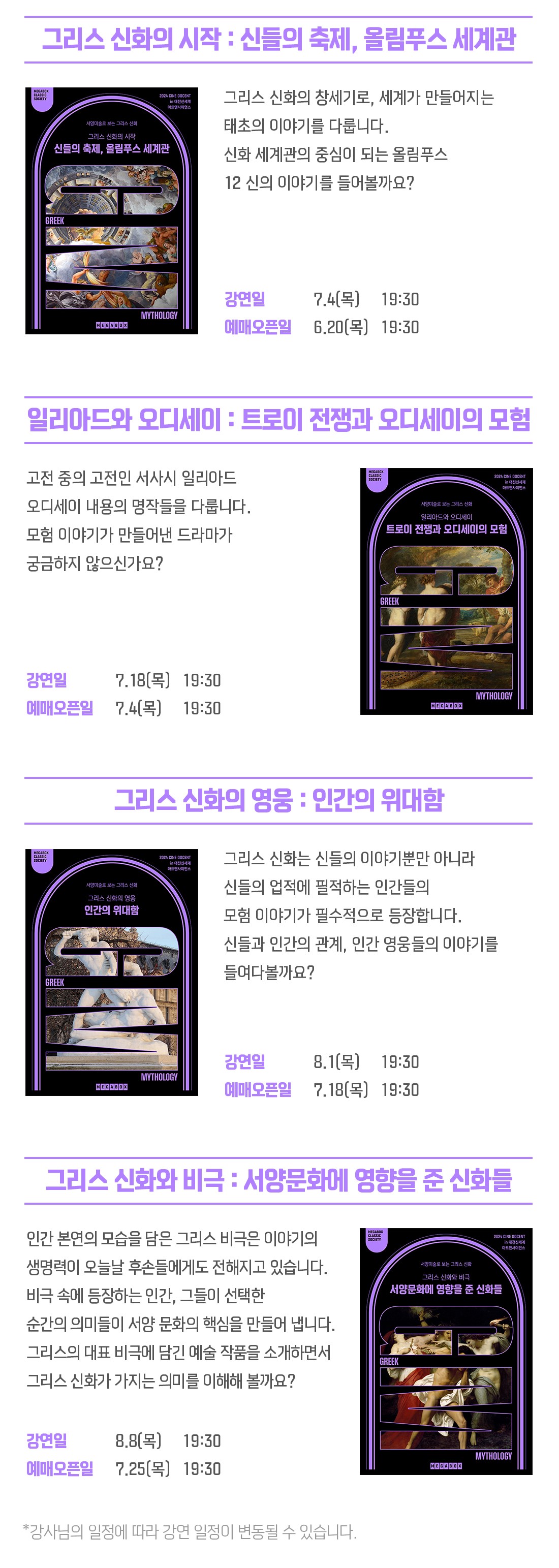 | 8/8(목) 19:30 | 7/25(목) 19:30 | 그리스 신화와 비극: 서양문화에 영향을 준 신화들 | |