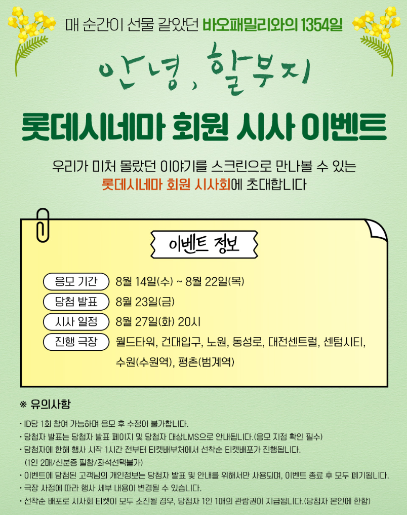 개봉에 앞서 롯데시네마에서 "안녕,할부지" 무료 시사회 이벤트도 진행됩니다.