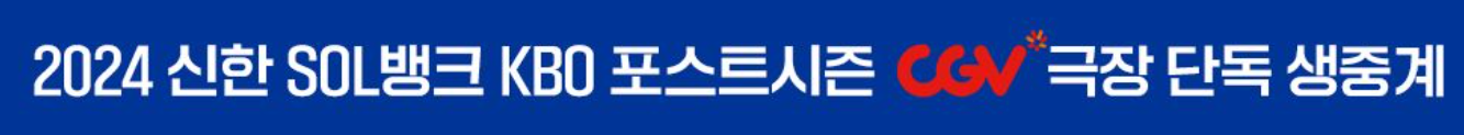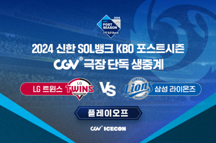현재 진행 중인 2024 KBO 플레이오프 < LG트윈스 vs 삼성라이온즈 > 경기중계하는 CGV 극장은 서울, 경기, 대구, 대전, 울산, 인천, 제주, 마산, 창원 등에서 중계됩니다.