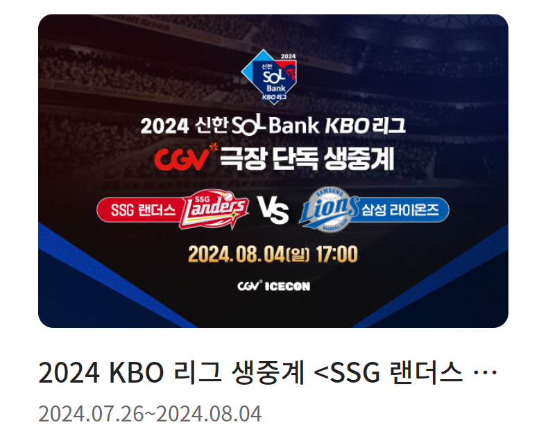 이번 SSG랜더스 vs 삼성라이온즈 경기중계하는 CGV 극장은