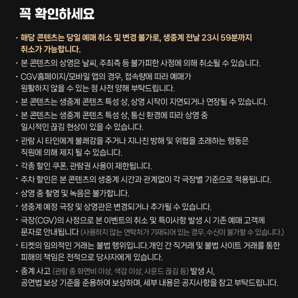 | - 우천 등으로 인해 경기 전 / 경기 도중 취소 시, 본 콘텐츠 상영 또한 취소되며 이러한 경우 일괄 환불 예정 - 노게임 선언 시 일괄 취소되며, 강우 콜드승 등 승패가 결정된 경기에 대해서는 별도 환불은 없음 - 경기 취소 시 동일 경기에 대한 추가 상영 편성은 없음 |