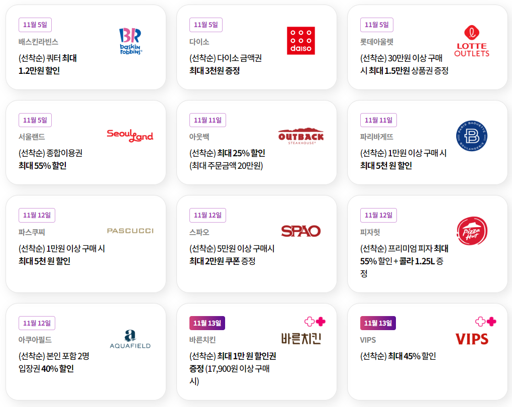 | 11월5일 (화) | 1. 베스킨라빈스(선착순) 쿼터 최대 1.2만원 할인 2. 다이소(선착순) 다이소 금액권 최대 3천원 증정 3. 롯데아울렛(선착순) 30만원 이상 구매시 최대 1.5만원 상품권 증정 4. 서울랜드(선착순) 종합이용권 최대 55% 할인 |