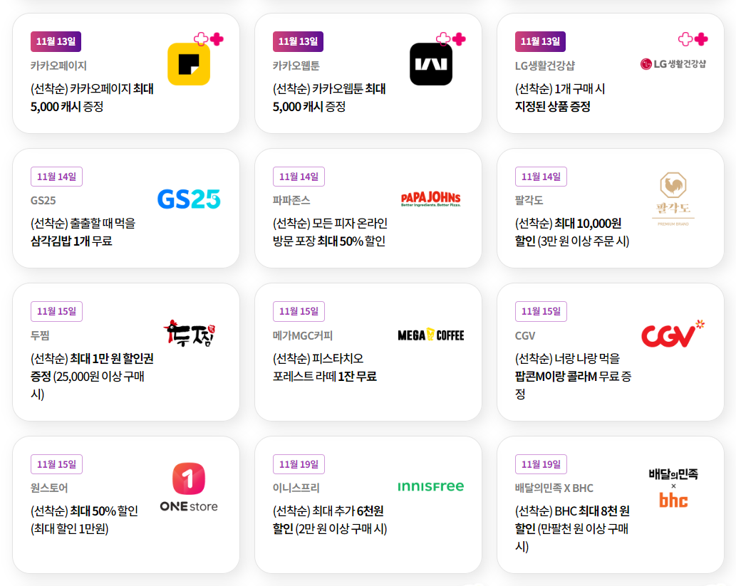 1. 바른치킨(선착순) 최대 1만원 할인권 증정 / 17,500원 이상 구매시 2. VIPS (선착순) 최대 45% 할인 3. 카카오페이지 (선착순) 최대 5,000원 캐시 증정 4. 카카오웹툰 (선착순) 최대 5,000원 캐시 증정 5. LG생활건강샵 (선착순) 1개 구매시 지정된 상품 증정 |