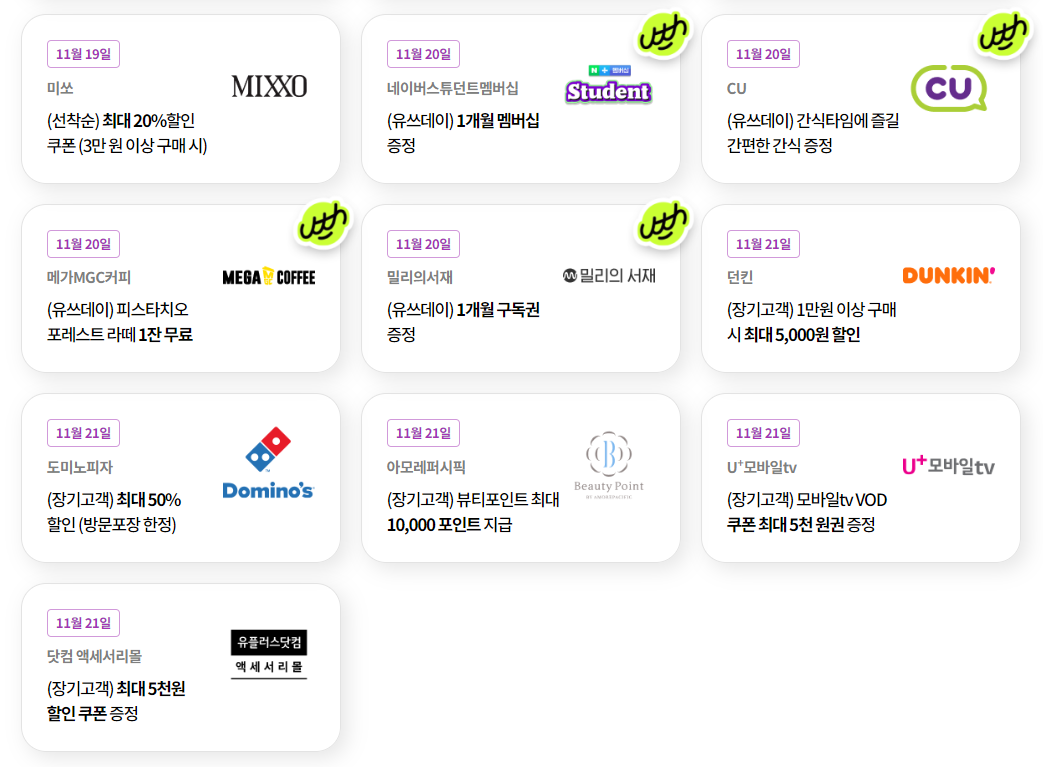 | 11월21일 (목) | 1. 던킨 (장기고객) 1만원 이상 구매시 최대 5,000원 할인 2. 도미노피자 (장기고객) 최대 50% 할인 / 방문포장 한정 3. 아모레퍼시픽 (장기고객) 뷰티포인트 최대 10,000포인트 지급 4. U+모바일tv (장기고객) 모바일tv VOD 쿠폰 최대 5천원권 증정 5. 닷컴 액세서리몰 (장기고객) 최대5천원 할인쿠폰 증정 |
