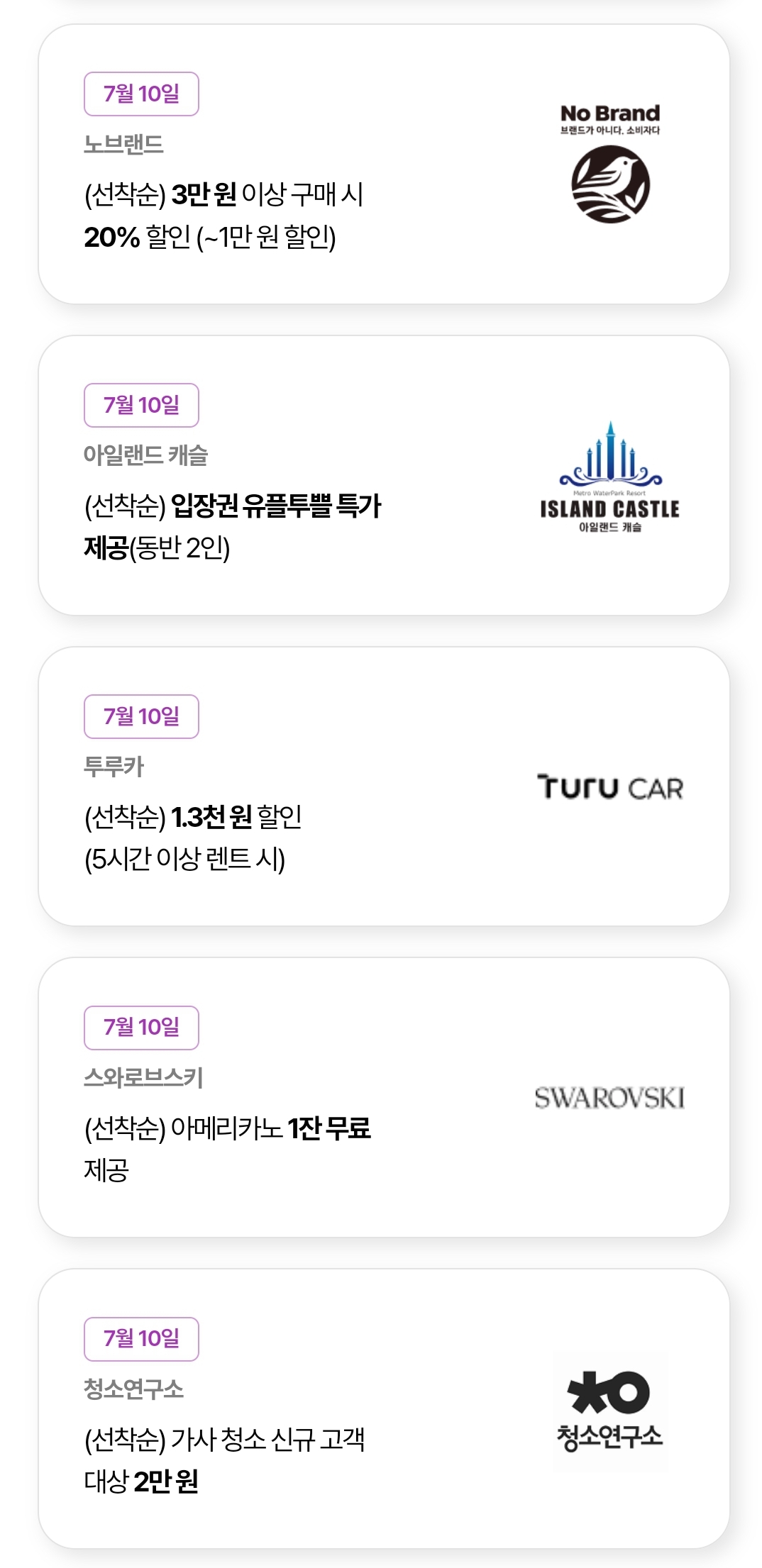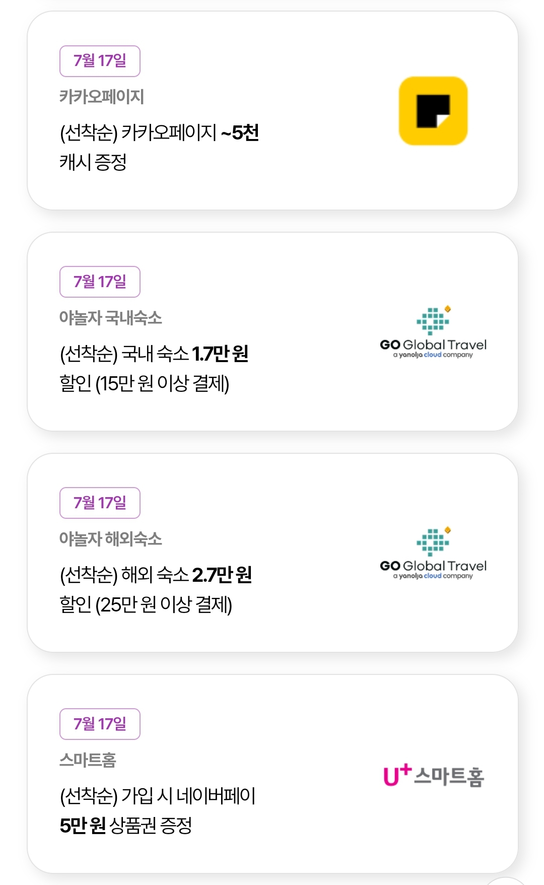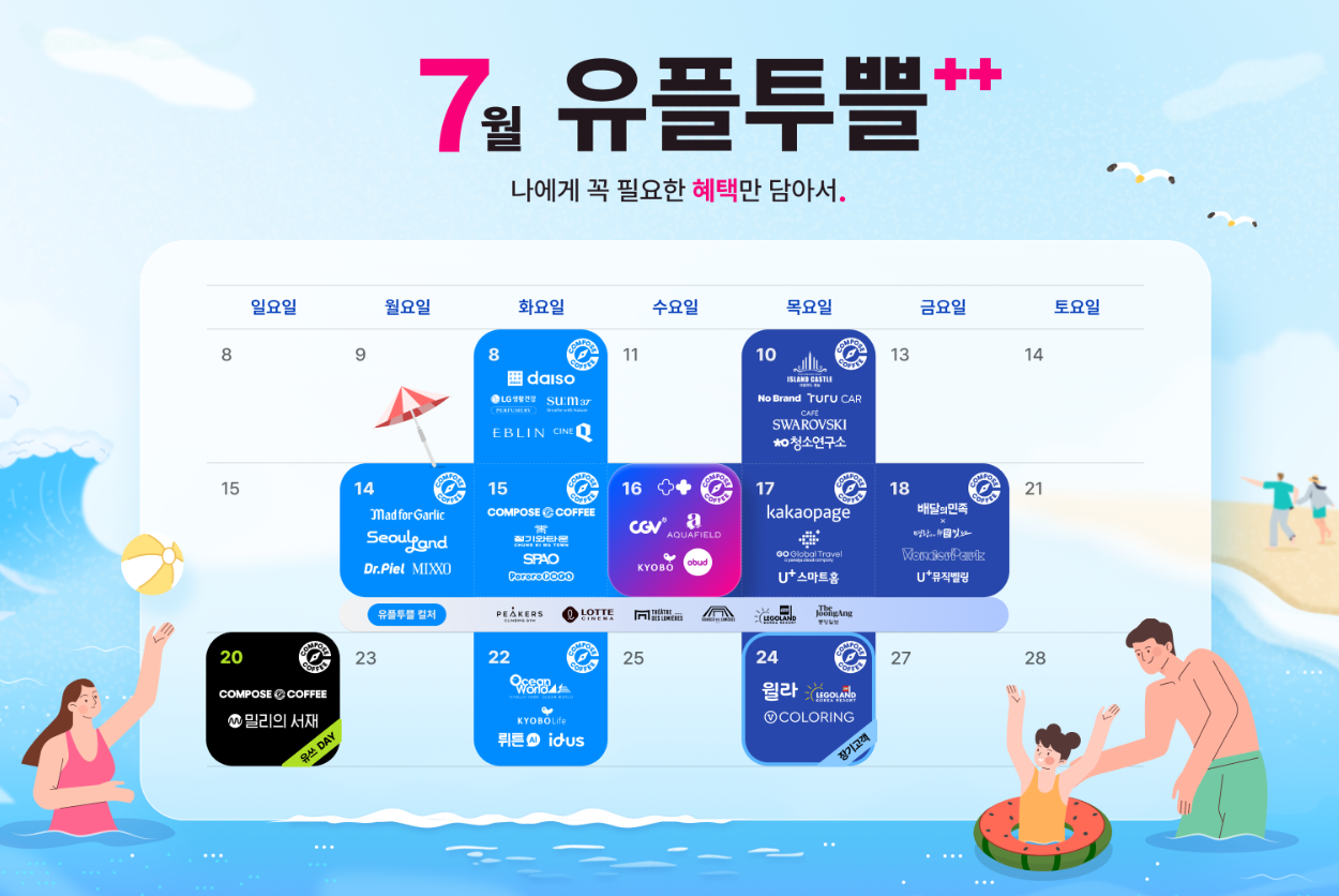 사랑받았던 인기혜택인 노브랜드 20% 할인 및 다이소 금액권 증정, 매드포갈릭 무료쿠폰, CGV 유플투쁠세트 증정, 컴포즈커피 커피무료 증정 등과 새롭게 추가된 배달의민족 명랑핫도그 할인쿠폰, 아이디어스 1년 무료이용권과 본격적인 여름을 맞이하여 서울랜드 할인쿠폰, 야놀자 할인쿠폰, 원더파크 할인쿠폰, 아쿠아필드 할인쿠폰, 아일랜드캐슬 특가쿠폰 등등 7월 8일부터 날짜마다 다른 혜택들이 제공됩니다.