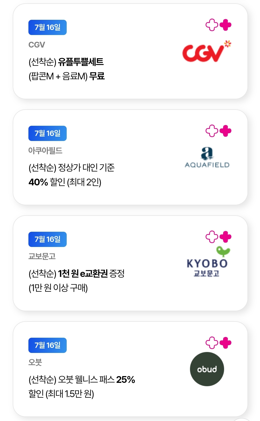 ★ 컴포즈커피 (선착순) 아이스아메리카노 1잔 증정 ★ 1. CGV (선착순) 유플투쁠세트 팝콘M+음료M 무료 2. 아쿠아필드 (선착순) 전 권종 최대 2인 40% 할인 3. 교보문고 (선착순) 1천원 e교환권 증정 / 1만원 이상 구매 4. 오붓 (선착순) 웰니스패스 15,000원 할인쿠폰 증정 |