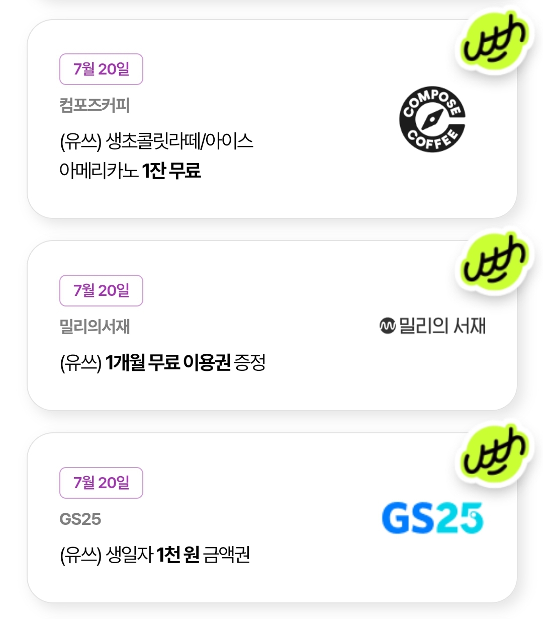 1. 컴포즈커피 (유쓰) 생초콜릿라떼 or 아메리카노 1잔 무료 2. 밀리의서재 (유쓰) 1개월 무료 이용권 증정 3. GS25 (유쓰) 유쓰 생일자 1천원금액권 ▶ 유쓰란? U+모바일을 사용하는 20대 (만19~29세) 고객 혜택 제공 ◀ |