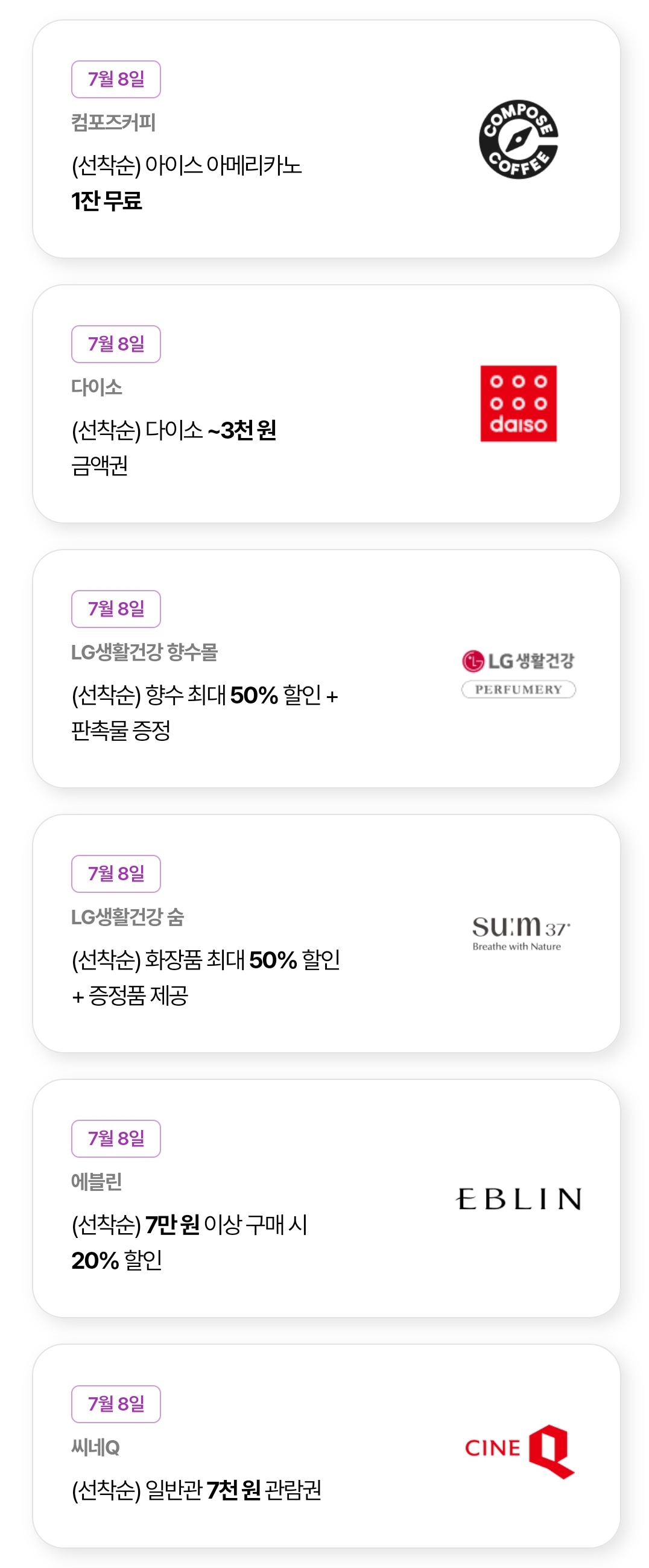 ★ 컴포즈커피 (선착순) 아이스아메리카노 1잔 증정 ★ 1. 다이소 (선착순) ~3천원 금액권 2. LG생활건강 (선착순) 향수 최대 50% 할인 / 명품 패션하우스 제작 판촉물 증정 3.LG생활건강 숨 (선착순) 최대 ~50% 할인 / 증정품 제공 4. 씨네Q (선착순) 일반관 7천원 관람권 증정 5. 에블린 (선착순) 20% 할인 / 7만원 이상 구매시 |