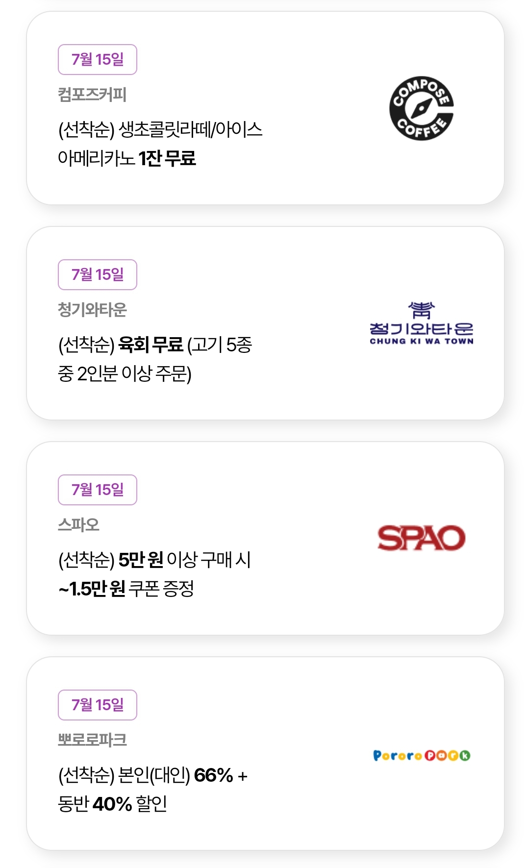 1. 컴포즈커피 (선착순) 생초콜릿라떼 or 아메리카노 1잔 무료 2. 청기와타운 (선착순) 육회 무료 / 고기5종 중 2인분 이상 주문 3. 스파오 (선착순) ~1.5만원 쿠폰 증정 / 5만원 이상 구매 4. 뽀로로파크 (선착순) 성인입장권 66% + 동반 1인 40% 할인 (월 1회) |