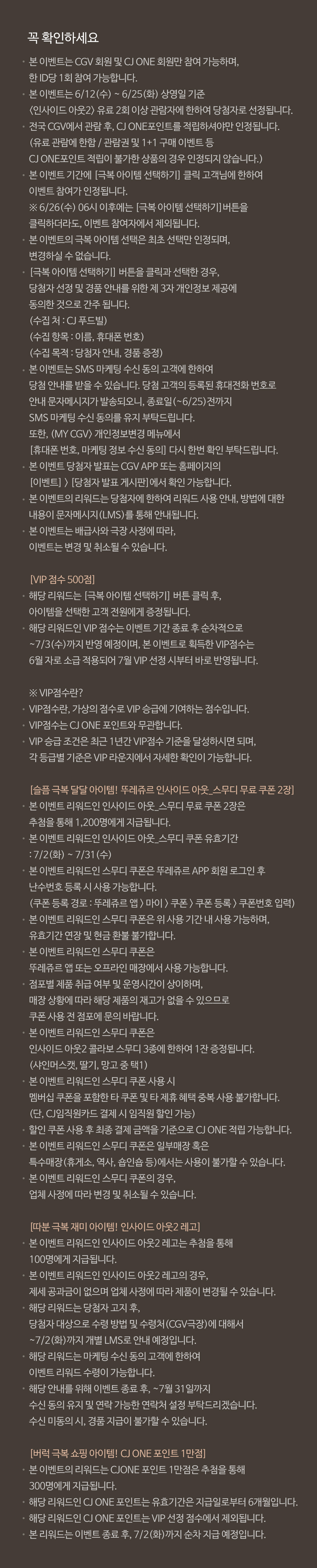 꼭 확인하세요 본 이벤트는 CGV 회원 및 CJ ONE 회원만 참여 가능하며, 한 ID당 1회 참여 가능합니다. 본 이벤트는 6/12(수) ~ 6/25(화) 상영일 기준 인사이드 아웃2 유료 2회 이상 관람자에 한하여 당첨