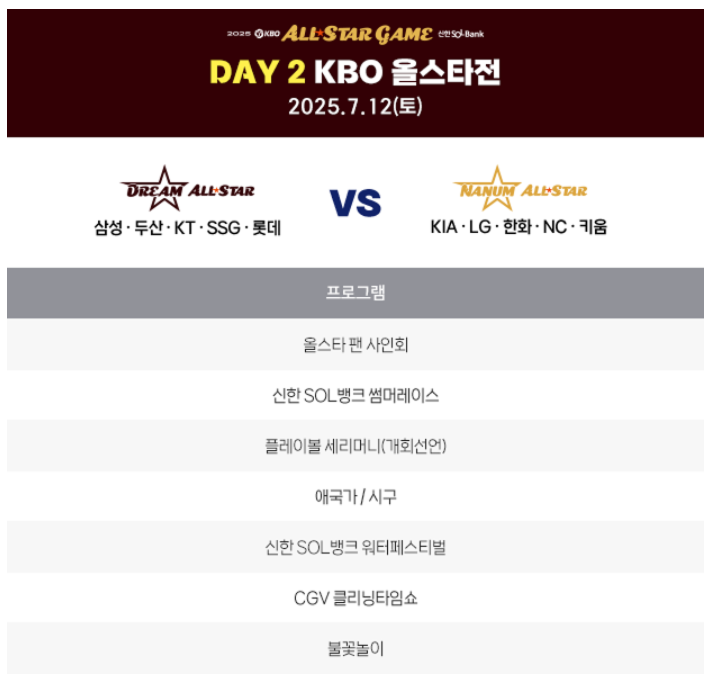 | 생중계 일정 | 2025년 7월 12일(토) 17:30 ~ 공식행사 / 18:00 ~ KBO 올스타전 ![]() |