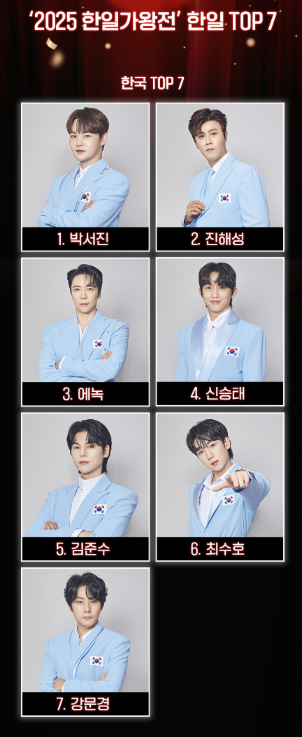 - 한국 TOP7 : 박서진, 진해성, 에녹, 신승태, 김준수, 최수호, 강문경