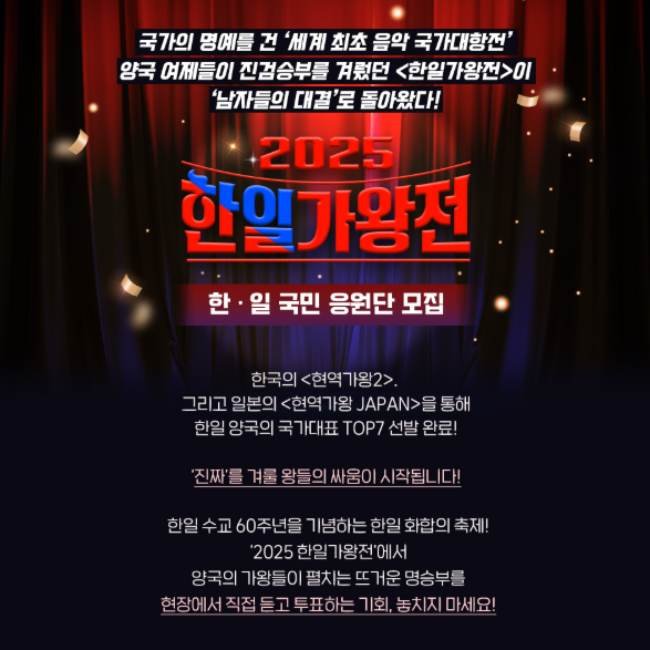 2025 한일가왕전 시즌2는 단순한 오디션이 아닌, 한·일 음악 문화 교류의 장입니다. 국민투표와 방청 참여는 단순한 응원이 아니라 무대의 결과를 직접 바꾸는 힘이 됩니다.