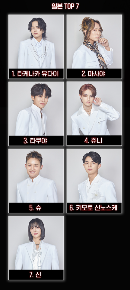 - 일본 TOP7 : 타케나카 유다이, 마사야, 타쿠야, 주니, 슈, 키모토 신노스케, 신
