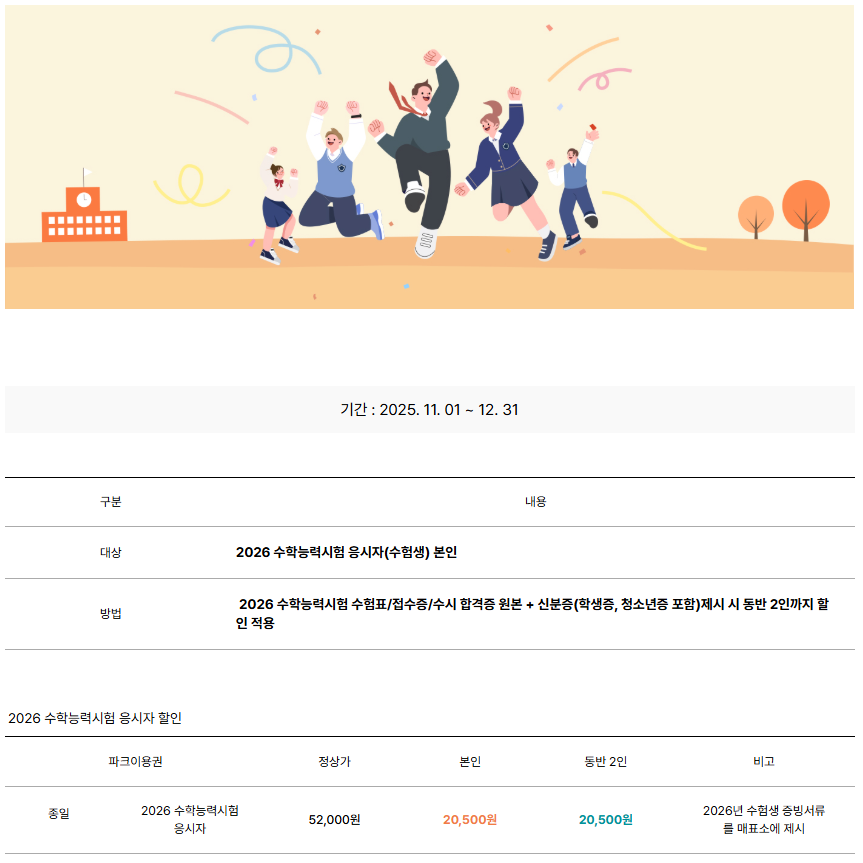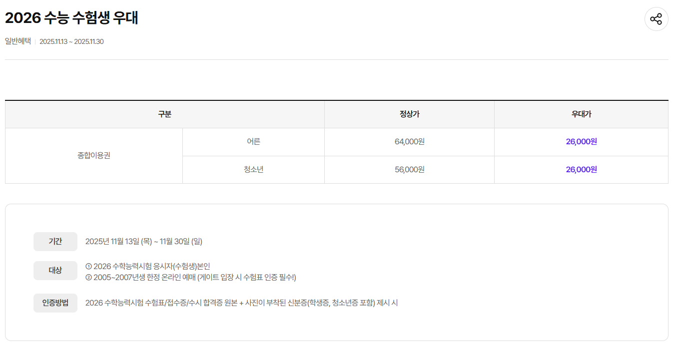 ■ 이용 방법: 현장매표소에 증빙서류 제시 ( 2026학년도 수능수험표, 수시합격증 원본 + 사진 부착된 신분증,학생증 )