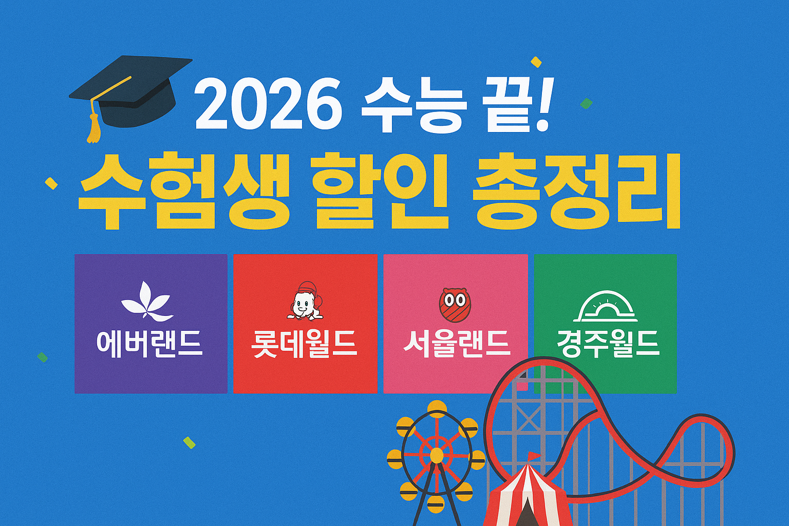 오늘은 에버랜드, 롯데월드, 서울랜드, 경주월드에서 진행 중인 2026년도 수험생 전용 할인 프로모션을 한눈에 정리해 드릴게요.