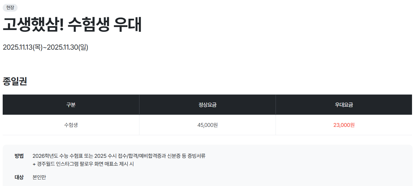 ■ 이용 방법: 증빙서류 제시 ( 2026학년도 수능수험표, 수시합격증, 수시접수증, 논술수험표, 신분증) + 경주월드 인스타그램 팔로우 화면 매표소 제시